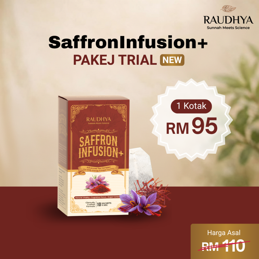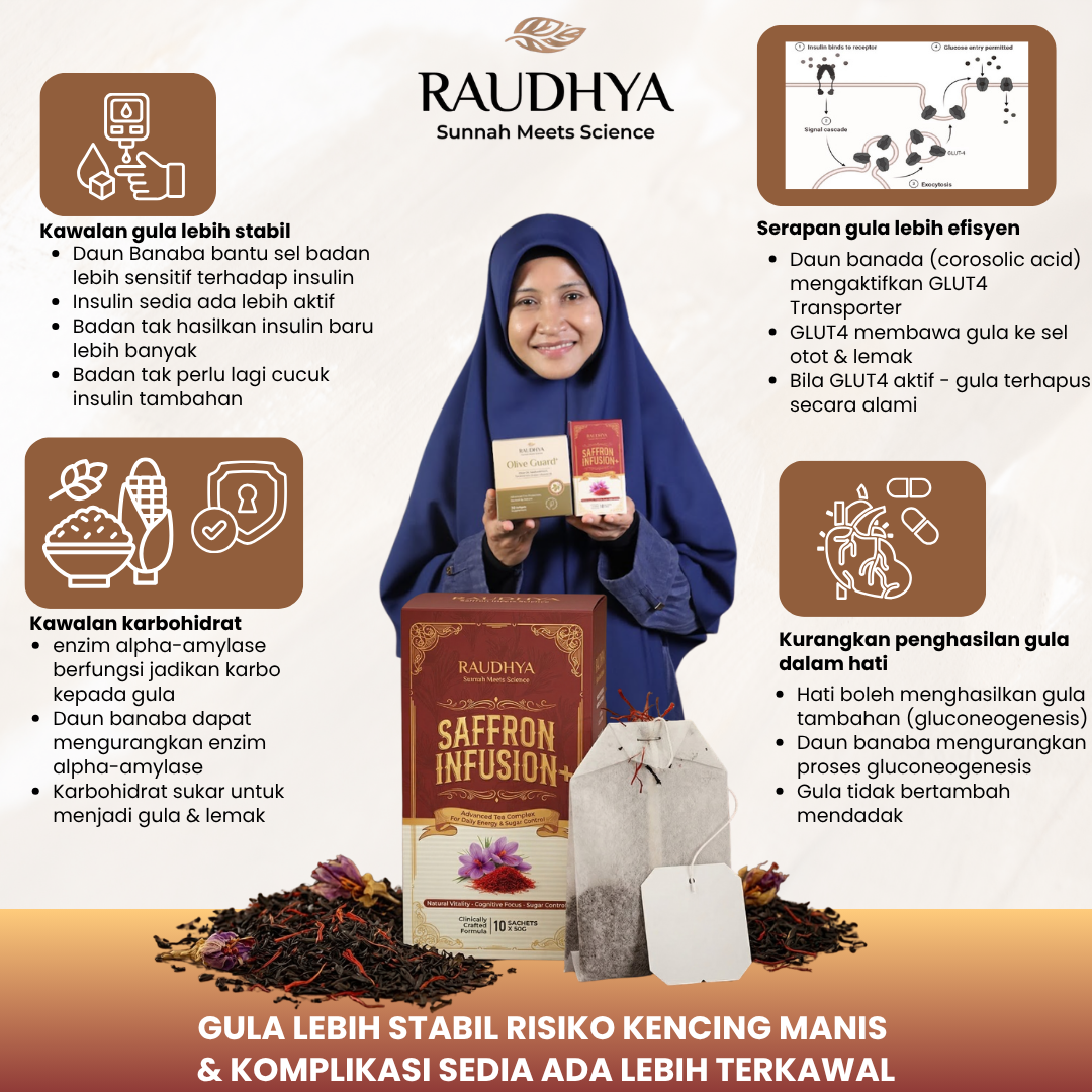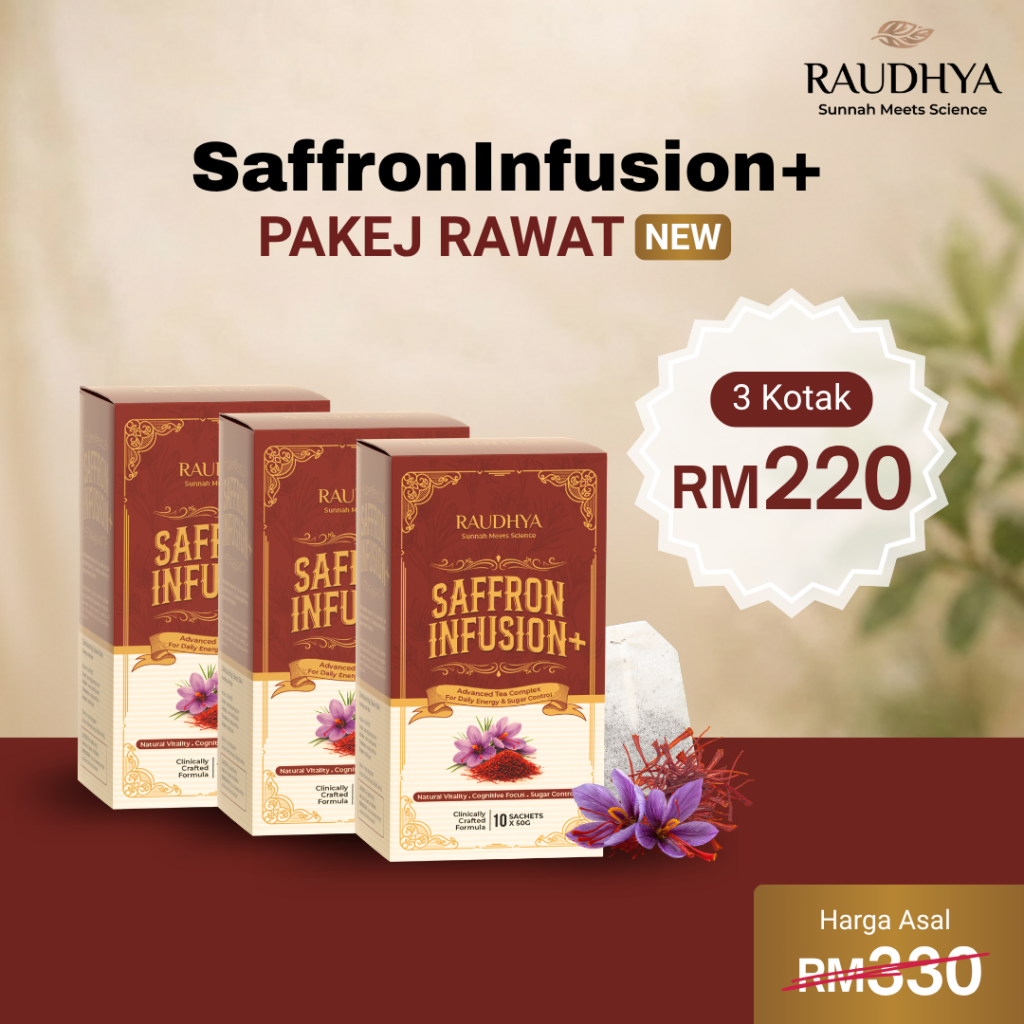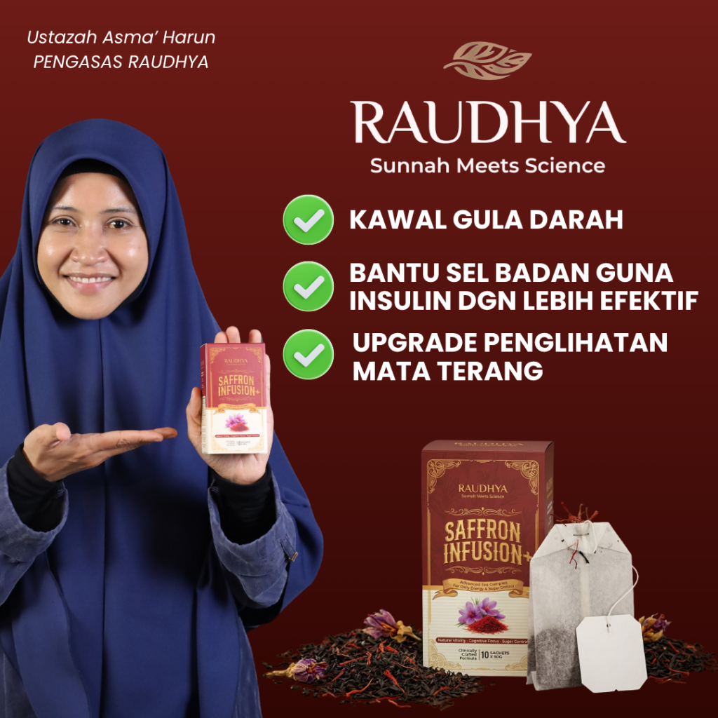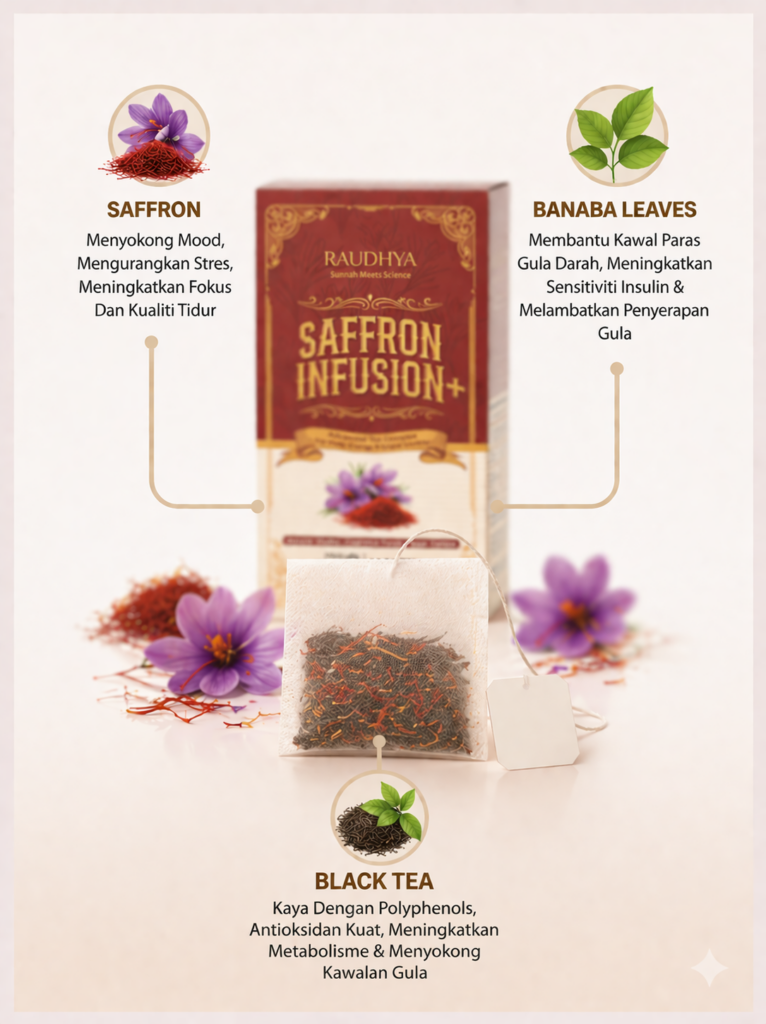 Raudhya Saffron Infusion Diperkaya Bahan Aktif Polyphenols, Corosolic Acid, Ellagitannins, serta Crocin & Safranal Menyokong Kawalan Gula, keseimbangan tenaga & kestabilan emosi secara semula jadi