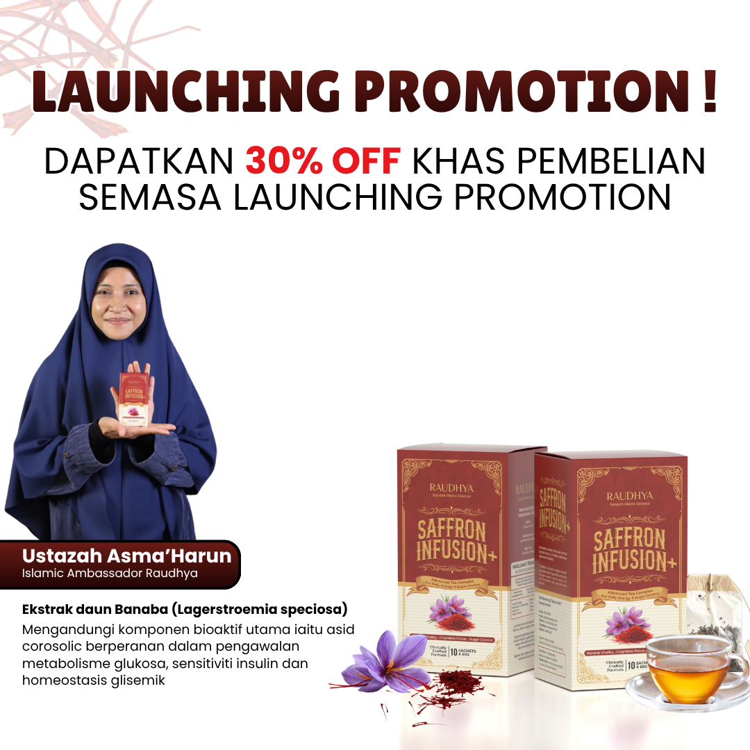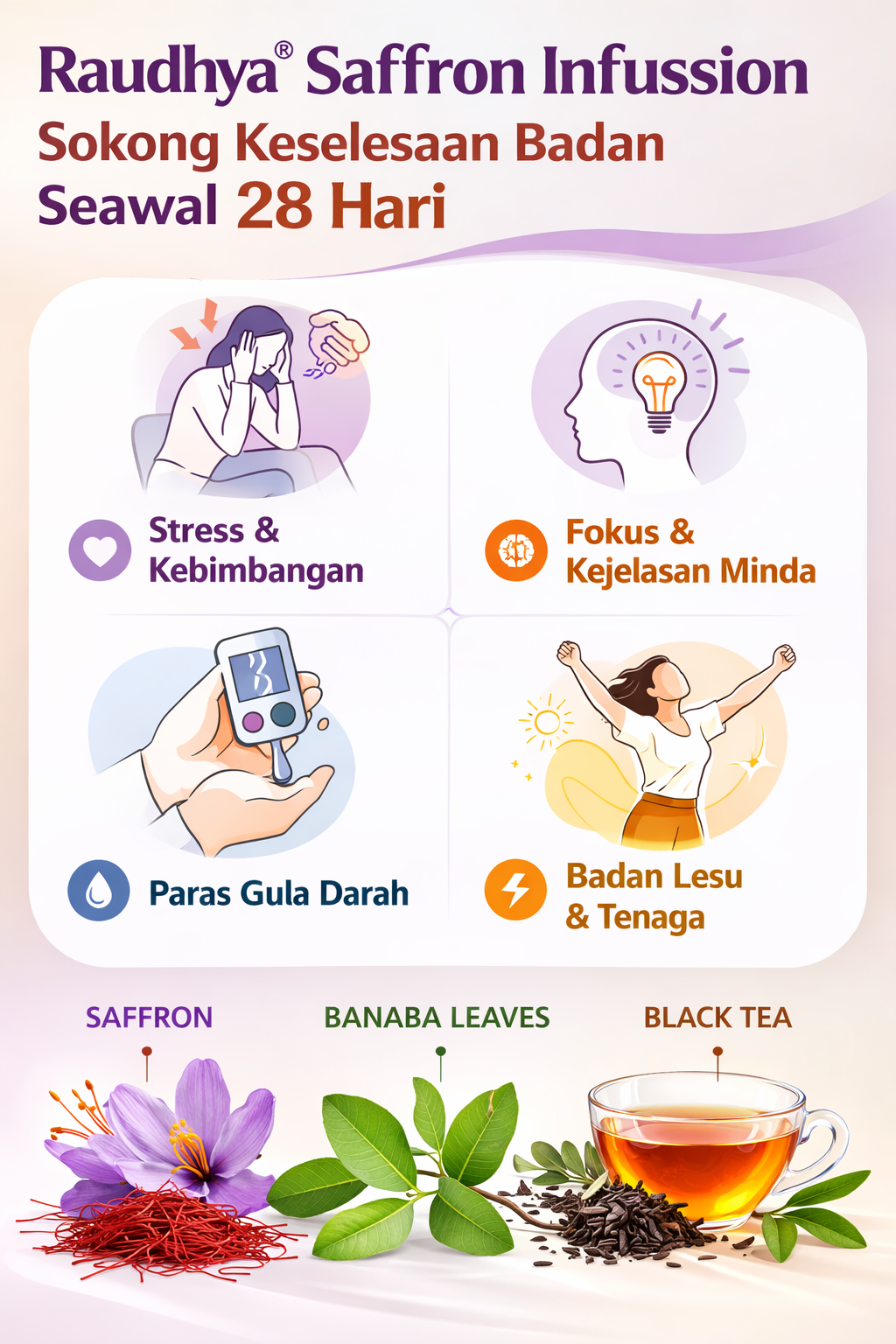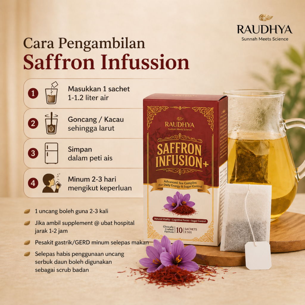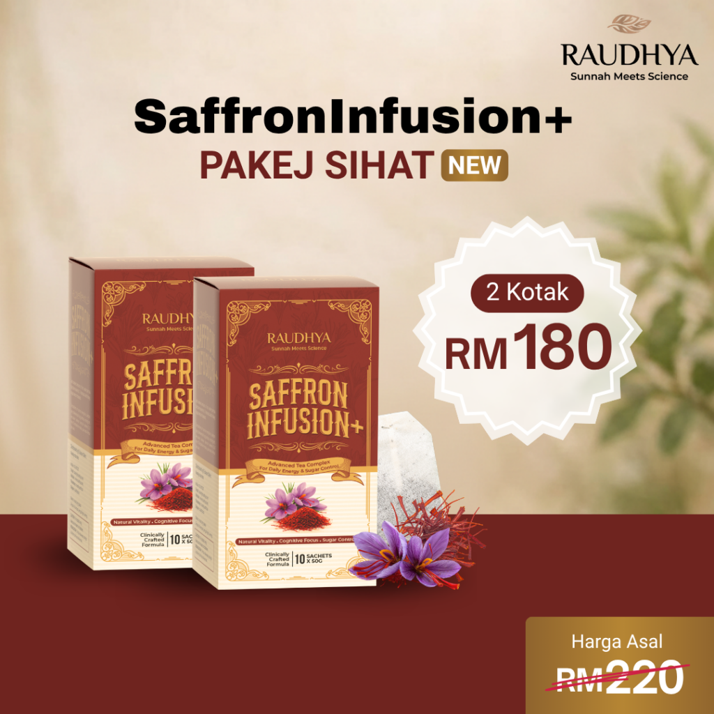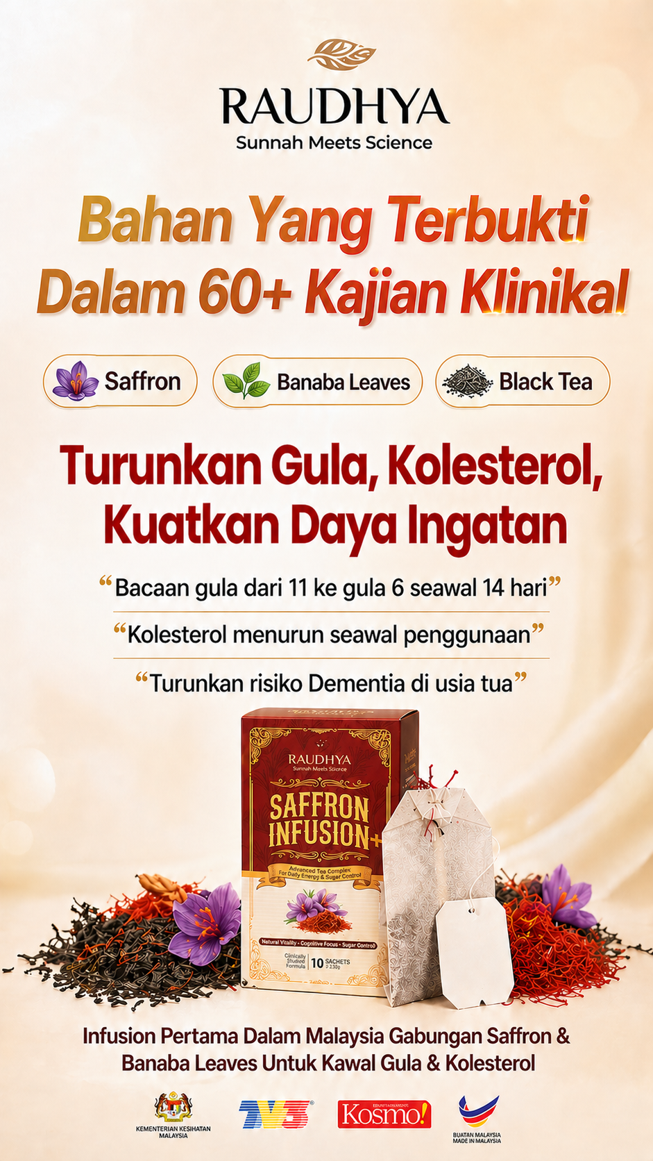 Raudhya Saffron Infusion Diperkaya Bahan Aktif Polyphenols, Corosolic Acid, Ellagitannins, serta Crocin & Safranal Menyokong Kawalan Gula, keseimbangan tenaga & kestabilan emosi secara semula jadi