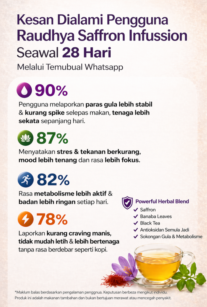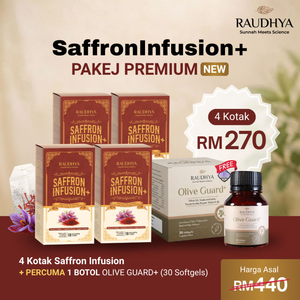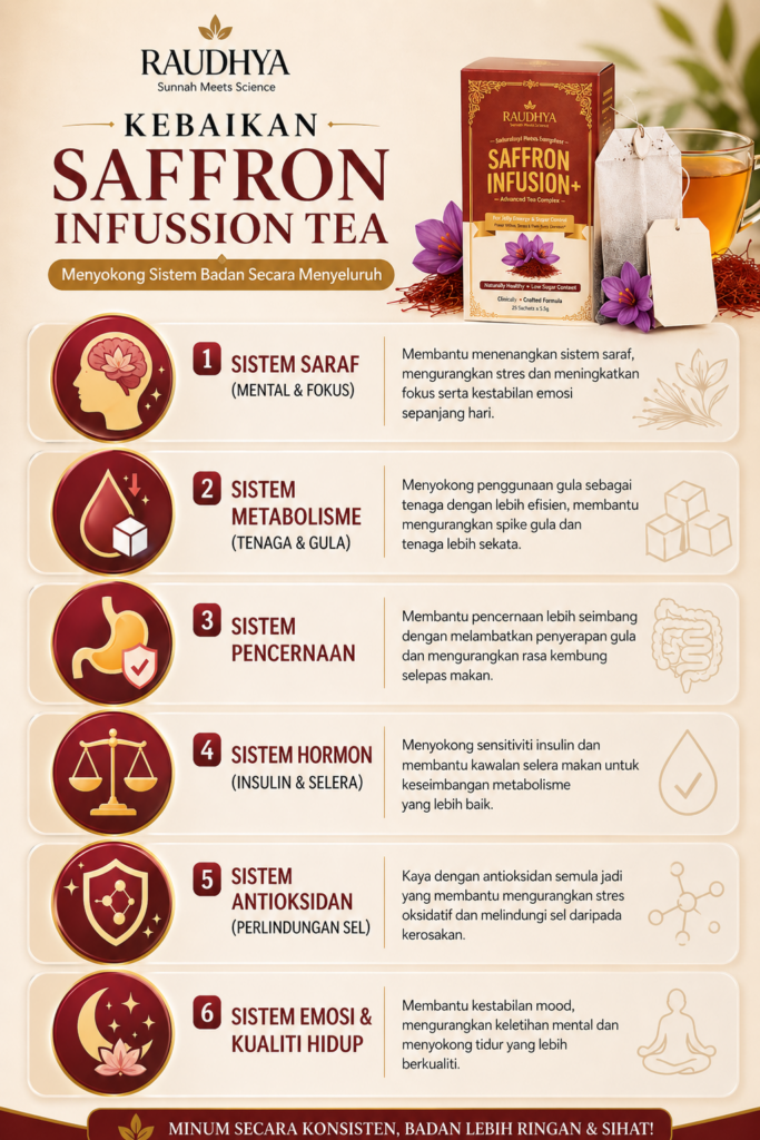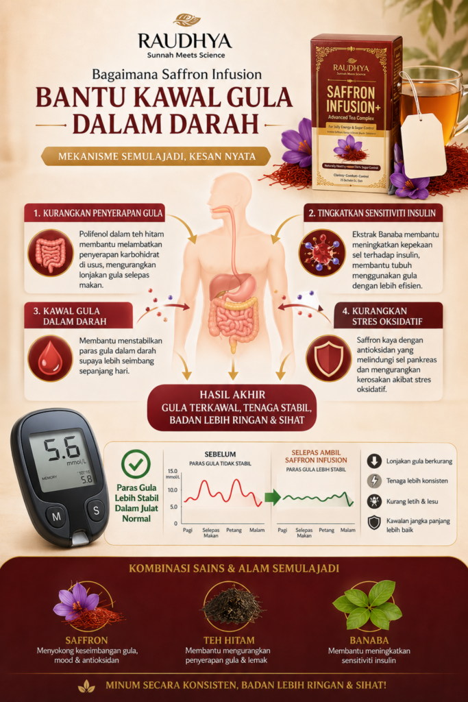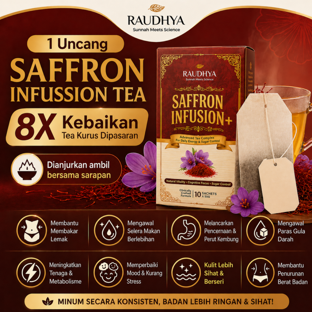 Raudhya Saffron Infusion Diperkaya Bahan Aktif Polyphenols, Corosolic Acid, Ellagitannins, serta Crocin & Safranal Menyokong Kawalan Gula, keseimbangan tenaga & kestabilan emosi secara semula jadi