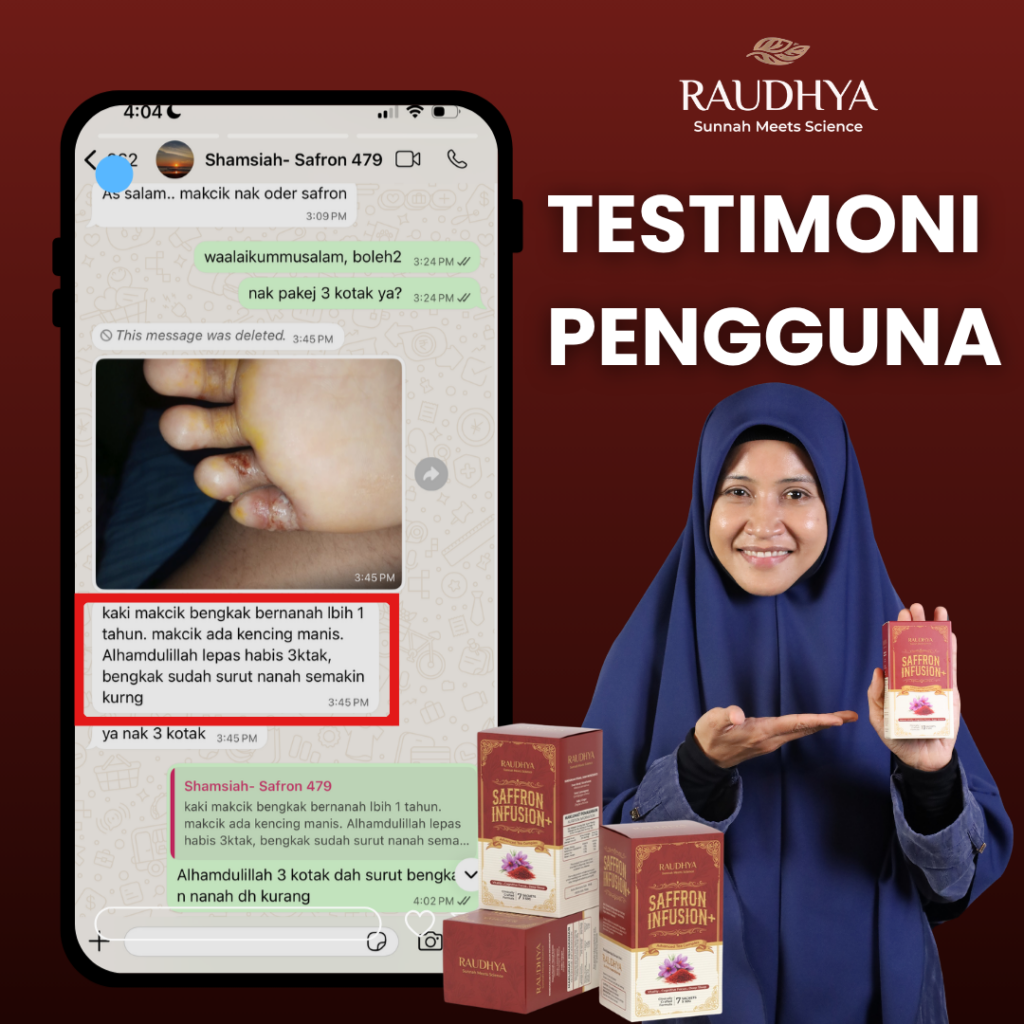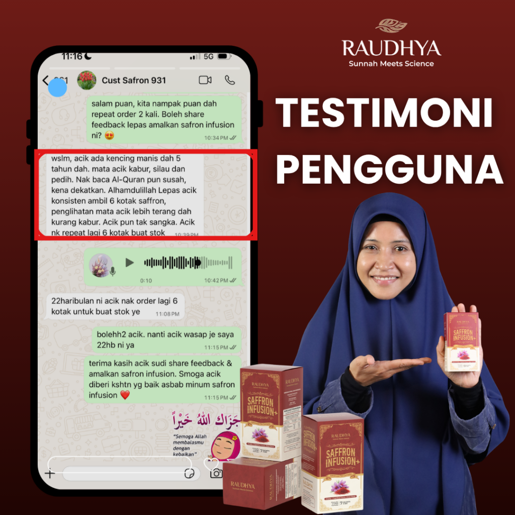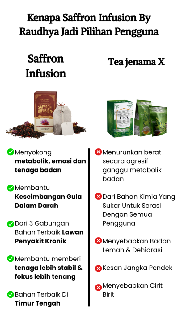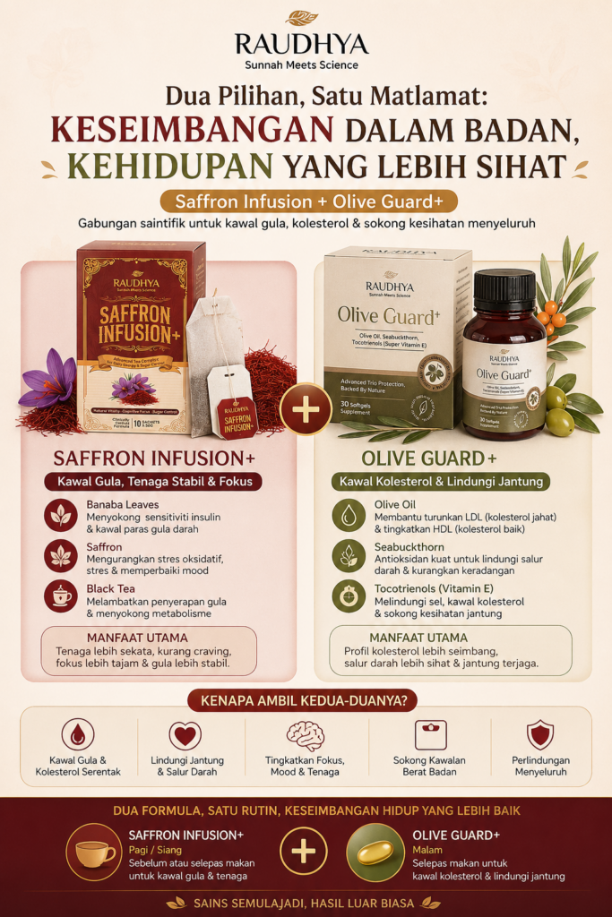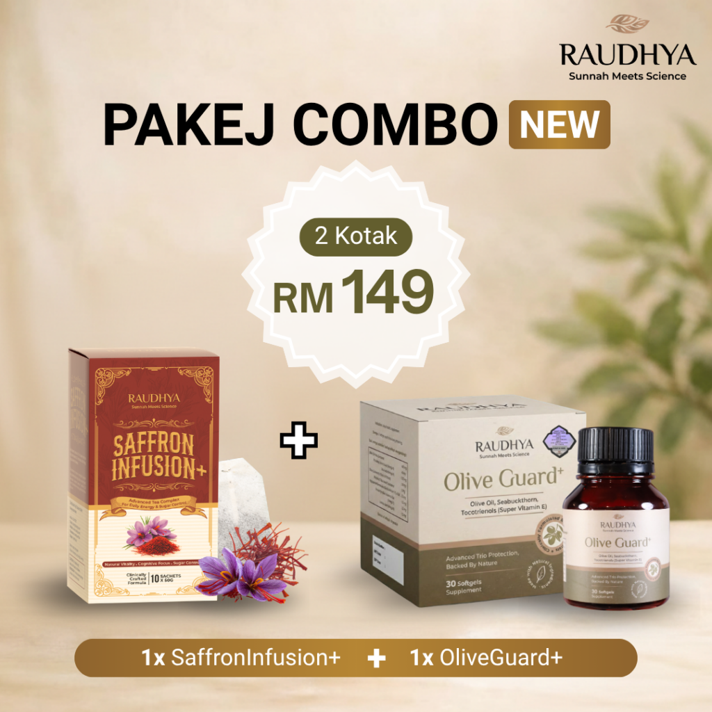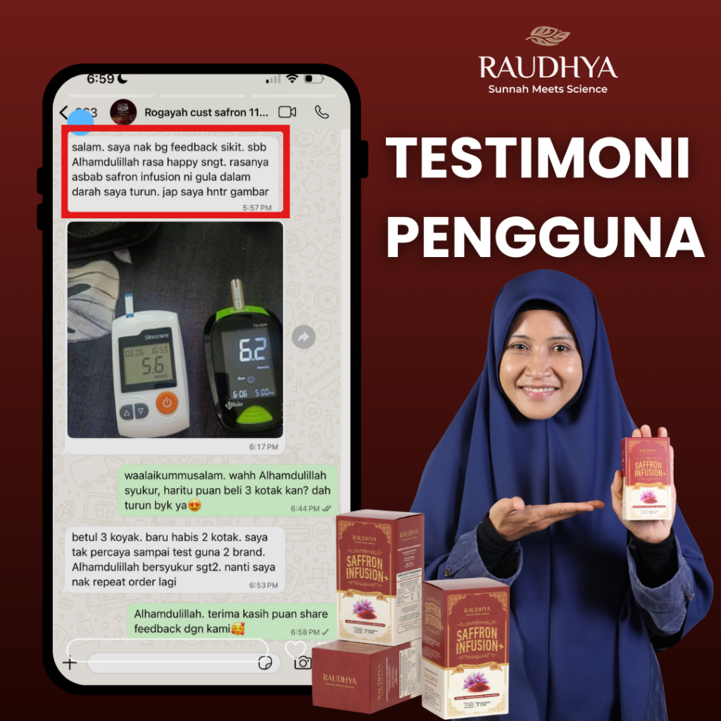 Raudhya Saffron Infusion Diperkaya Bahan Aktif Polyphenols, Corosolic Acid, Ellagitannins, serta Crocin & Safranal Menyokong Kawalan Gula, keseimbangan tenaga & kestabilan emosi secara semula jadi
