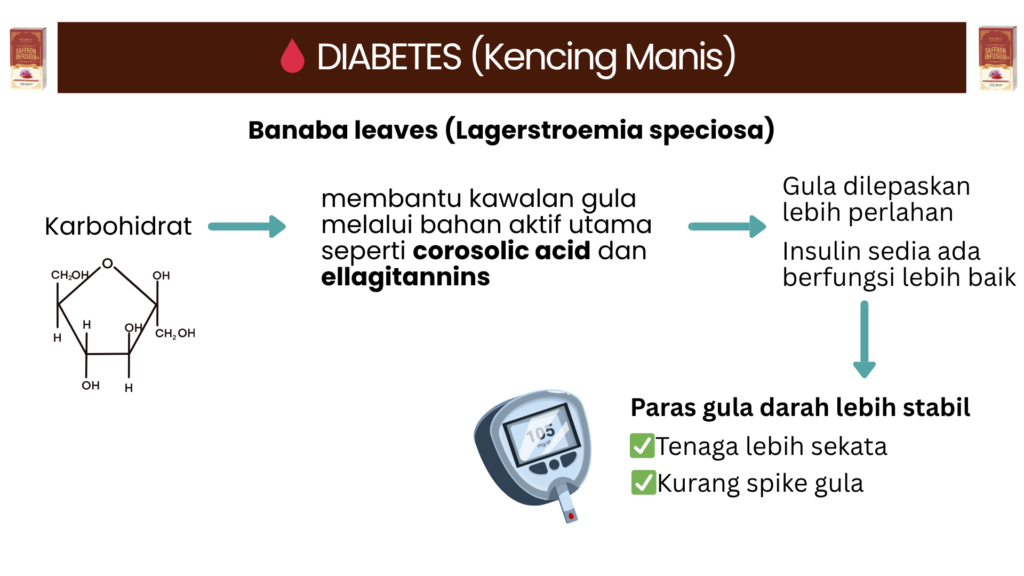 Ekstrak daun Banaba (Lagerstroemia speciosa) mengandungi komponen bioaktif utama iaitu asid corosolic, yang berperanan dalam pengawalan metabolisme glukosa, sensitiviti insulin dan homeostasis glisemik.